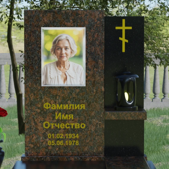 Кому подойдет: Данная модель является универсальной благодаря своему лаконичному и одновременно глубокому дизайну. Она станет достойным выбором как для мужчины, так и для женщины. Строгость линий и золотые акценты подчеркнут статус и мужество, а плавные изгибы верхней грани привнесут нотки женственности и нежности. Этот мемориал выбирают те, кто хочет выразить глубокое уважение и создать на кладбище место, преисполненное достоинства и тишины, где каждый элемент — от лампады до фактуры камня — говорит о вечной любви.