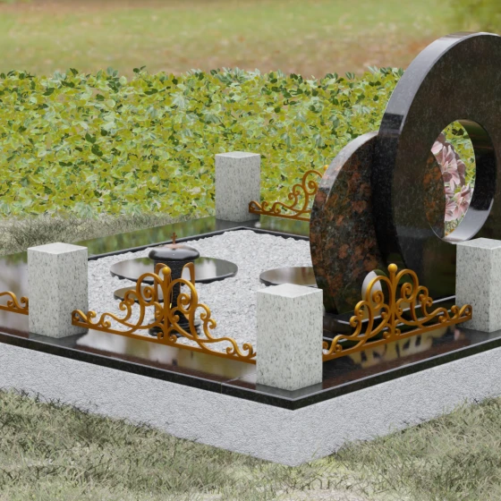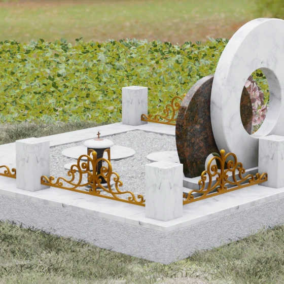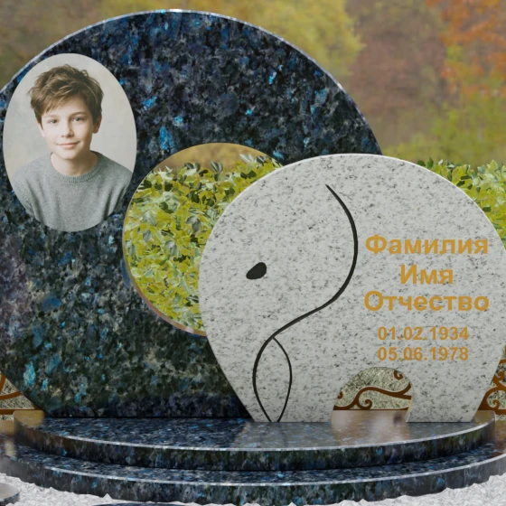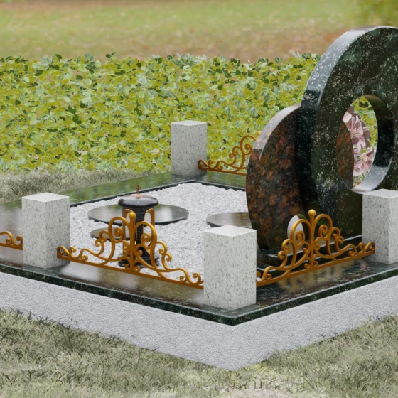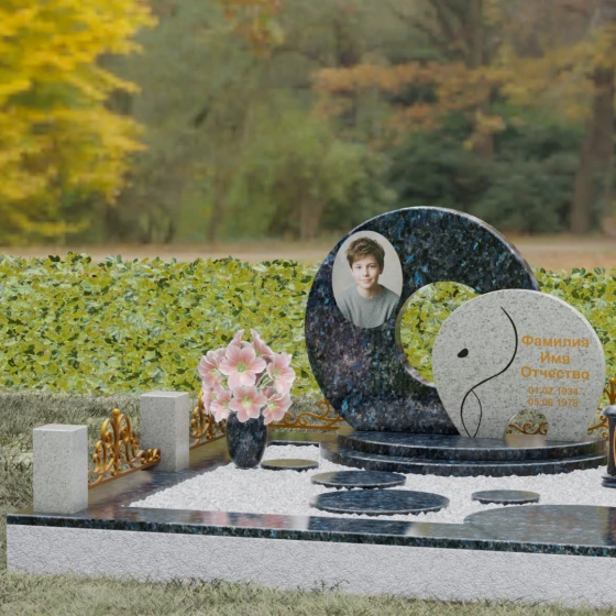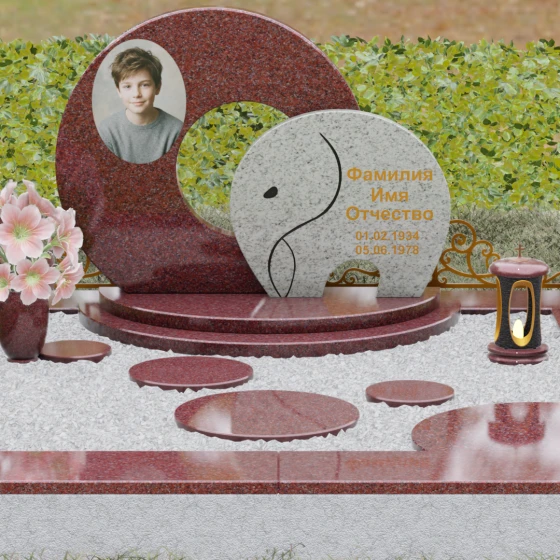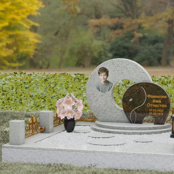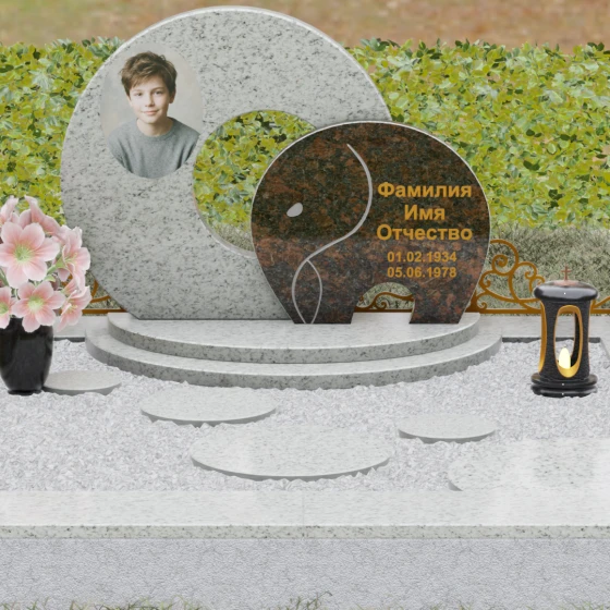 Данная мемориальная композиция (Артикул 134) представляет собой подлинный триумф архитектурной мысли, воплощенный в камне. В центре ансамбля находится величественная стела, состоящая из двух идеально выверенных дисков, которые словно накладываются друг на друга, создавая глубокий символизм бесконечности и цикличности бытия. Геометрия модели лишена острых углов: плавные, скругленные линии подчеркивают гармонию и умиротворение. Основной диск имеет сквозное круглое отверстие, что придает конструкции визуальную легкость и многогранность, в то время как передний сегмент из контрастного камня украшен изящной, лаконичной резьбой. Тонкая, едва уловимая линия художественной гравировки на фронтальной части напоминает стилизованный росток или абстрактный силуэт, подчеркивая индивидуальность мемориала. Массивная конструкция установлена на многоступенчатый круглый подиум, который возвышает монумент над землей, создавая эффект торжественности и непоколебимой надежности.