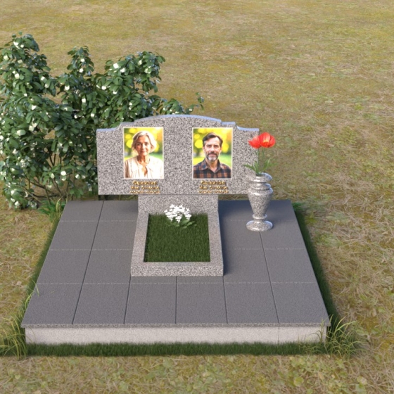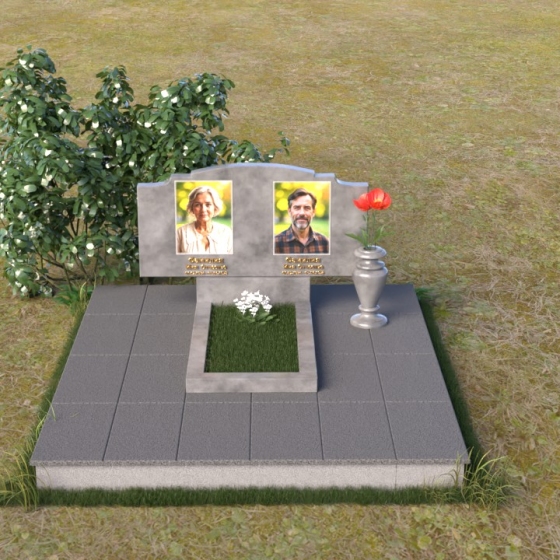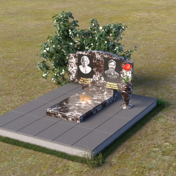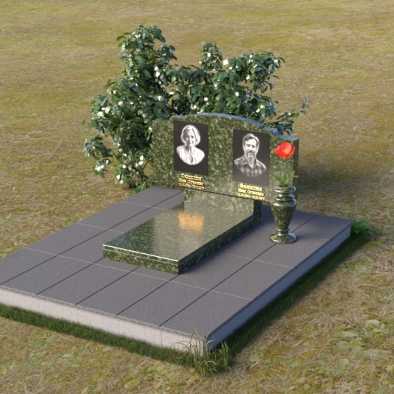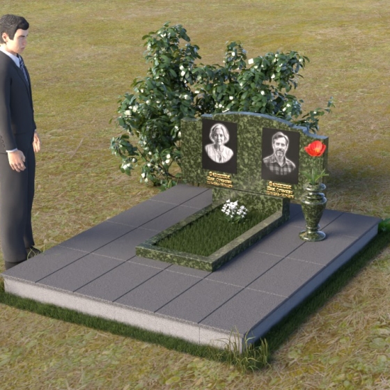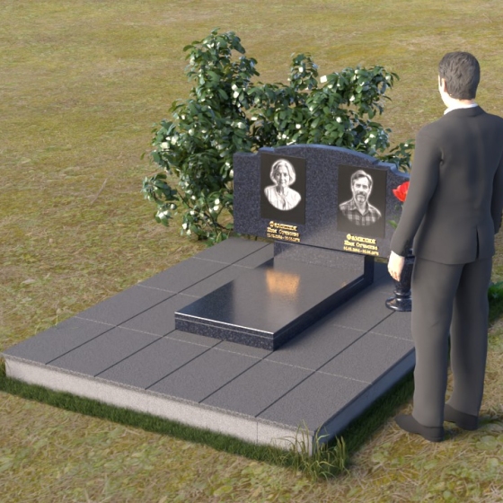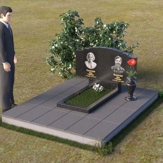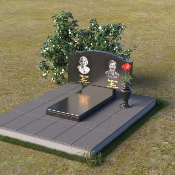 Этот гранитный монумент представляет собой композицию, где каждая деталь продумана до мелочей. Верхняя часть памятника имеет фигурную форму с плавными, волнообразными очертаниями, словно застывшая мелодия скорби. Верхний край обработан таким образом, что создает впечатление легкой, воздушной драпировки. Боковые грани аккуратно скруглены, смягчая строгость камня и придавая ему более изящный вид. Фаски, снятые по периметру, подчеркивают контур и добавляют выразительности. Лицевая поверхность отполирована до зеркального блеска, отражая свет и создавая ощущение глубины. На полированной поверхности выгравированы портреты усопших и памятные надписи, выполненные с особой тщательностью и вниманием к деталям. Под основной плитой располагается горизонтальная плита, также выполненная из черного гранита, создающая дополнительный уровень и подчеркивающая монументальность композиции. На ней размещена еще одна полированная плита, но уже меньшего размера, как символ нерушимости и продолжения рода.