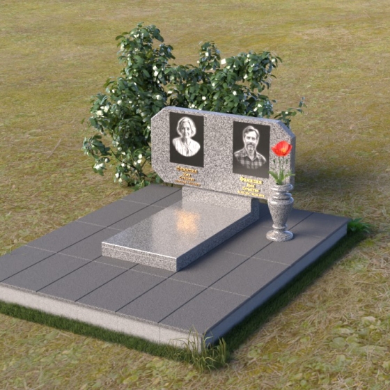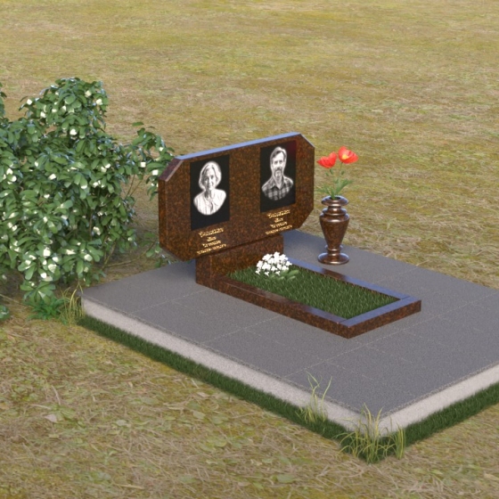 Композиция памятника строится на контрасте строгих геометрических форм и плавных линий, символизирующих жизненный путь и обретение покоя. Стела имеет форму, близкую к прямоугольнику, но с элегантно скошенными углами, смягчающими ее строгость. Верхняя часть стелы имеет две небольшие грани, словно фацеты драгоценного камня, добавляющие ей изысканности. Поверхность камня отполирована до зеркального блеска, что подчеркивает глубину черного цвета и создает ощущение торжественности. На лицевой стороне размещены портреты усопших, выполненные с высокой степенью детализации. Ниже портретов выгравированы надписи, выполненные строгим шрифтом. Справа от стелы установлена небольшая ваза, выполненная в том же стиле, что и памятник, и украшенная простым, но элегантным орнаментом.