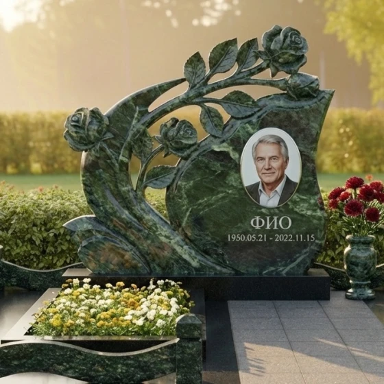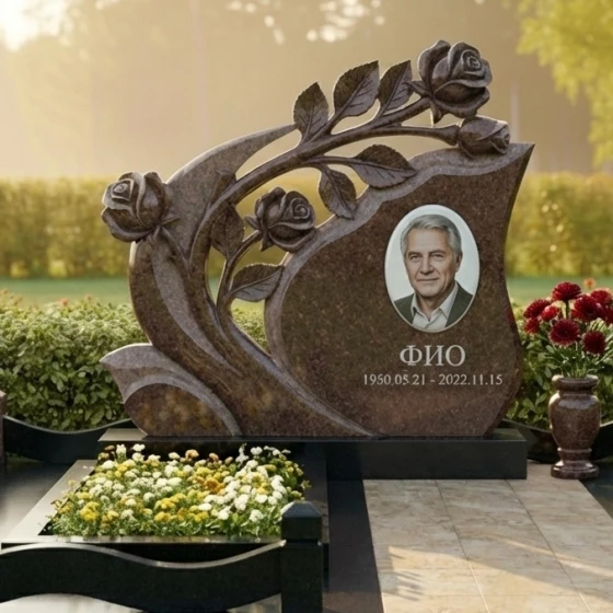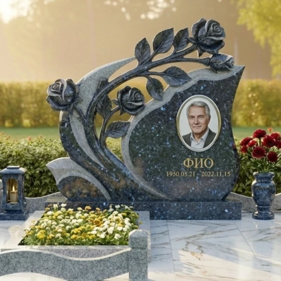 Мемориальная композиция Артикул: ПН 431 представляет собой подлинное произведение искусства, воплощенное в камне. Ее эстетика пронизана глубоким символизмом и изысканной детализацией, призванной увековечить светлую память о человеке. Центральным элементом композиции является стела необычной, динамичной формы, напоминающей развевающееся знамя или раскрывающийся бутон. Ее плавные, изогнутые линии создают ощущение легкости и движения, несмотря на массивность материала. Верхняя часть стелы элегантно изгибается вправо, а левая сторона украшена объемной резьбой в виде ветви розы с распустившимися бутонами. Каждая роза выполнена с поразительной детализацией: лепестки мастерски вырезаны, создавая ощущение их нежности и природной красоты, а бутоны словно вот-вот раскроются, символизируя вечную жизнь и непреходящую любовь. Резные элементы, выполненные в глубоком черном граните, контрастируют с безупречно отполированной основной поверхностью стелы, создавая игру света и тени, подчеркивающую объем и утонченность работы. Этот контраст между зеркальным блеском и матовой глубиной резьбы придает композиции особую выразительность и благородство.