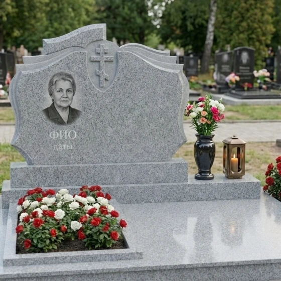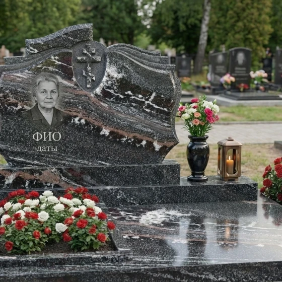 В основе композиции лежит монументальное надгробие, чья форма вызывает ассоциации с раскрытой книгой или древним свитком, символизируя жизненный путь, записанный в вечности. Плавные, волнообразные изгибы верхней части мемориальной плиты, напоминающие страницы, перелистываемые ветром времени, придают конструкции особую элегантность и динамику. В центре верхней части, на фоне глубокой черной полировки, вырезан лаконичный православный крест, выполненный в строгих, классических линиях, без излишних деталей, что подчеркивает его духовную значимость и чистоту веры. Крест, слегка утопленный в камень, создает игру света и тени, делая его объемным и выразительным. Ниже, в левой части надгробия, расположено искусно выполненное портретное изображение, обрамленное в овальную рамку, которая гармонично вписывается в общий контур. Под портретом предусмотрено место для имени и дат жизни, выгравированных четким и торжественным шрифтом, что завершает центральную часть композиции.