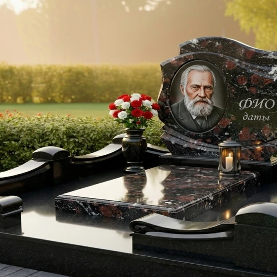 Ритуальное изделие Артикул: ПН 462 — это не просто камень, это произведение искусства, созданное для того, чтобы увековечить светлую память о дорогом человеке. Каждая линия, каждый изгиб этой композиции пропитаны глубоким смыслом и стремлением выразить безграничную любовь и уважение. Перед нами предстает величественная стела, выполненная в благородном черном цвете, который символизирует глубину скорби и одновременно незыблемость вечной памяти. Ее форма представляет собой гармоничное сочетание плавных волн и строгих линий, создающих ощущение динамики и одновременно спокойствия. Верхняя часть стелы словно парит, образуя изящные изгибы, напоминающие страницы открытой книги или легкие складки драпировки, что придает изделию особую выразительность и утонченность. Грани стелы тщательно отполированы до зеркального блеска, отражая окружающий мир и создавая игру света и тени, которая придает камню живое сияние. В центре стелы, на идеально гладкой поверхности, выгравирован портрет усопшего — лик, полный мудрости и спокойствия, выполненный с невероятной детализацией, передающей каждую черточку лица и глубину взгляда. Рядом с портретом, словно нежное напоминание о жизненном пути, расположены ФИО и даты жизни, выполненные элегантным шрифтом.