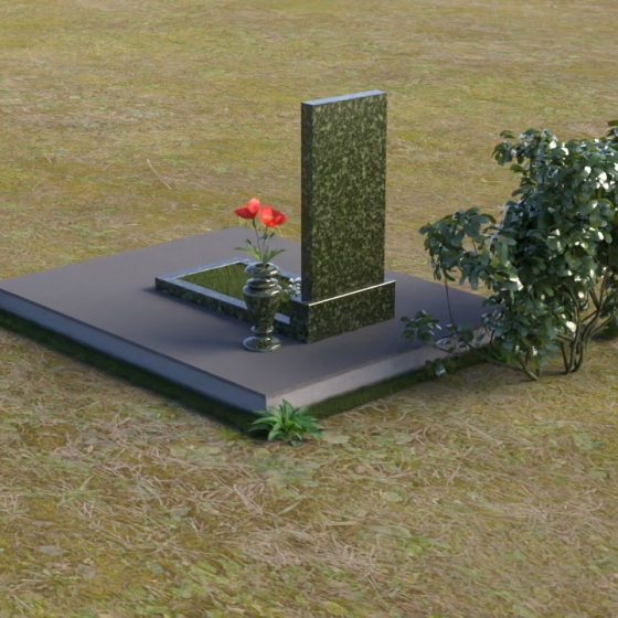 Мемориальная композиция представляет собой вертикальную стелу, выполненную в строгой прямоугольной форме, символизирующей стойкость и незыблемость памяти. Верхняя часть стелы, с ее четкими гранями, словно устремлена ввысь, к небесам, напоминая о духовной составляющей человеческой жизни. Боковые грани стелы обработаны с особой тщательностью, создавая эффект благородной сдержанности. Фаска, аккуратно снятая по периметру, придает изделию завершенный и элегантный вид. Горизонтальная плита, расположенная перед стелой, выполнена в зеркальной полировке, отражая небо и окружающий мир, символизируя продолжение жизни и связь с ушедшим.