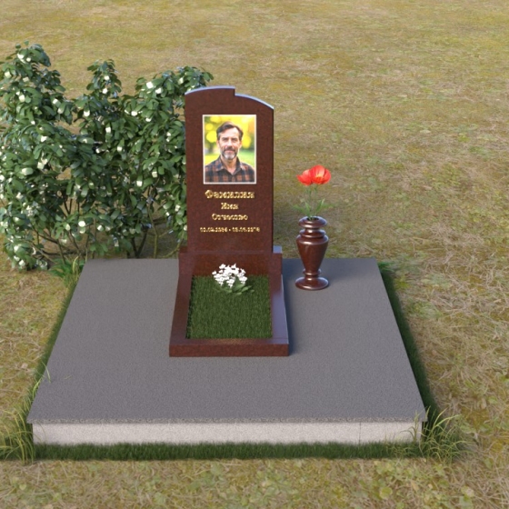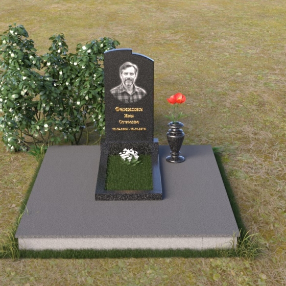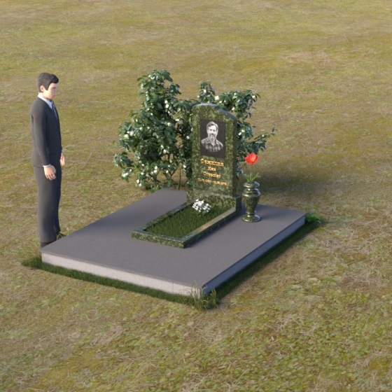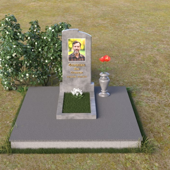 Геометрия модели продумана до мельчайших деталей. Начиная с основания, мы видим широкую плиту, обеспечивающую устойчивость всей конструкции. На ней возвышается горизонтальная плита меньшего размера, выполненная в зеркальной полировке, отражающая небо и окружающий мир, словно запечатлевая в себе мгновения жизни. Вертикальная стела, возвышающаяся над плитой, имеет сглаженные углы и плавные переходы, смягчающие строгость формы. Верхняя часть стелы, с ее деликатными сколами, придает ей уникальность и неповторимость. Рядом со стелой располагается небольшая ваза, выполненная в том же стиле, предназначенная для живых цветов, символизирующих вечную память и любовь.