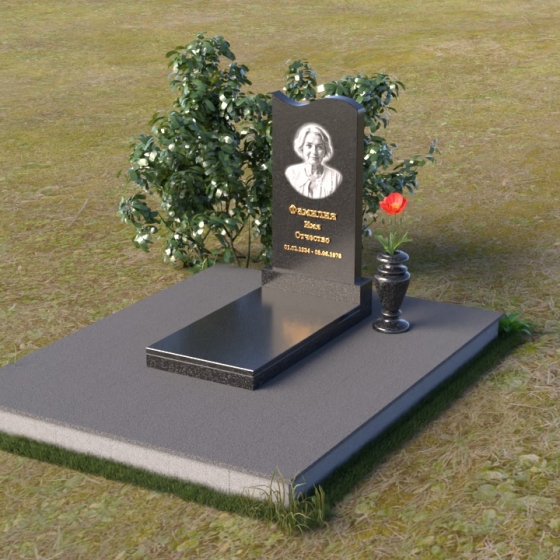 Под стелой располагается горизонтальная плита, также выполненная из полированного гранита, создающая ощущение завершенности и гармонии. Ее зеркальная поверхность отражает небо и облака, словно стирая границу между земным и небесным. Вместе стела и плита образуют единый ансамбль, который органично вписывается в ландшафт, подчеркивая красоту и умиротворение места захоронения. Черный цвет гранита символизирует скорбь и уважение, а его плотная структура гарантирует долговечность и устойчивость к любым погодным условиям. Этот памятник – достойное обрамление памяти о близком человеке, которое будет служить напоминанием о его жизни для будущих поколений.