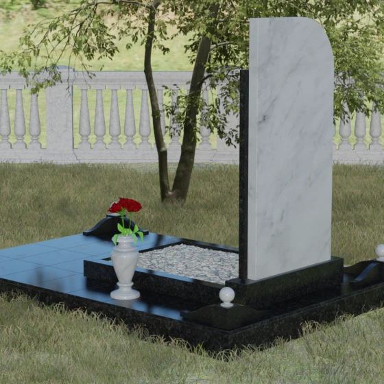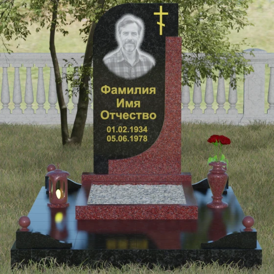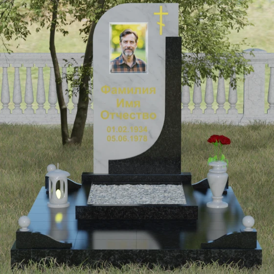 Данная модель отличается уникальной комбинированной архитектурой, которая мгновенно приковывает взгляд за счет игры форм и цветов. Основная вертикальная стела имеет асимметричный силуэт: ее левая сторона плавно закругляется, образуя изящную волну, в то время как правая грань остается подчеркнуто строгой и прямой. Это сочетание мягкости и твердости символизирует дуальность жизни. С правой стороны стелу дополняет контрастная вертикальная вставка из камня другого оттенка, которая придает всей конструкции объем и архитектурную завершенность. В верхней части основной плиты лаконично расположен православный восьмиконечный крест, выполненный методом глубокой гравировки с последующим золочением. Его строгие линии подчеркивают духовную значимость монумента, не перегружая общую композицию лишними деталями.