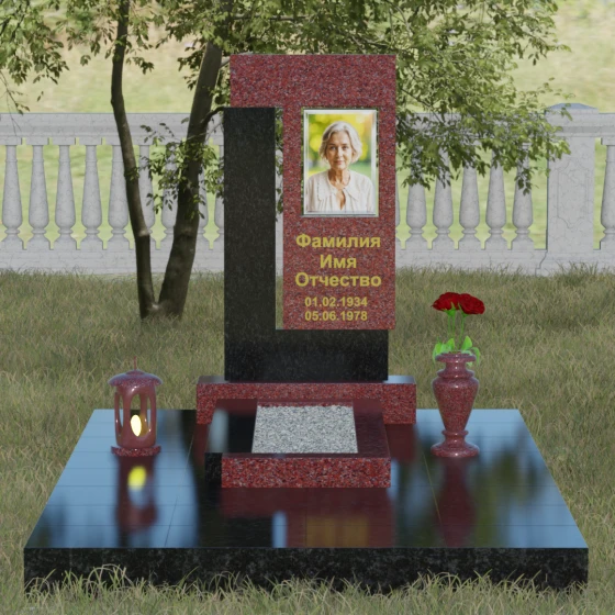 Целостность мемориального комплекса обеспечивается продуманным благоустройством. Стела устанавливается на массивный каменный постамент, который служит надежным фундаментом. Композицию гармонично дополняют аксессуары из аналогичного камня: точеная гранитная ваза для живых цветов и закрытая лампада, подчеркивающие аккуратность и ухоженность места захоронения. Сплошная надгробная плита, выполненная в едином стиле, придает участку завершенный вид и препятствует прорастанию сорной травы, сохраняя эстетику ландшафта в любое время года.