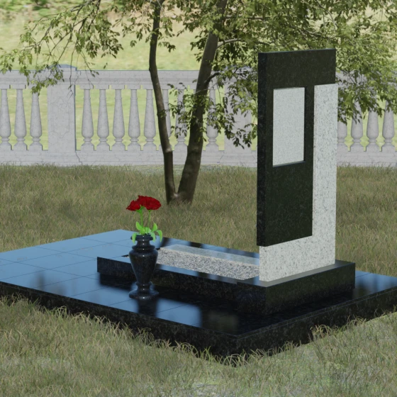 Данная модель мемориала представляет собой торжество современной архитектурной мысли, выраженное в строгой геометрии и выверенных пропорциях. Это надгробие из натурального камня привлекает внимание своим асимметричным, но идеально сбалансированным дизайном. Композиция строится на гармоничном сочетании двух Г-образных блоков, которые словно «входят» друг в друга, символизируя неразрывную связь, единство и завершенность жизненного пути. Вертикальная ориентация стелы подчеркивает стремление вверх, а безупречно прямые углы и острые грани придают монументу монументальность и благородство. Отсутствие лишнего декора компенсируется богатством фактуры: идеально зеркальная полировка основной плоскости контрастирует с матовой глубиной боковых срезов, создавая эффектный визуальный объем.