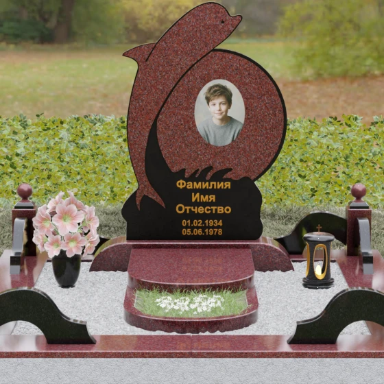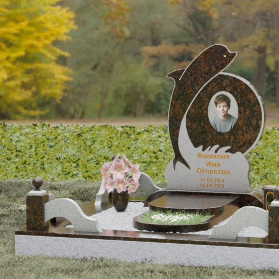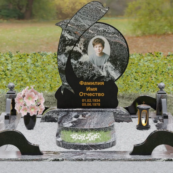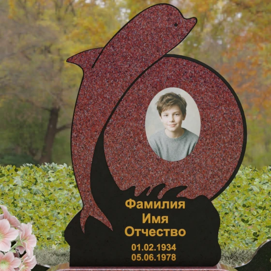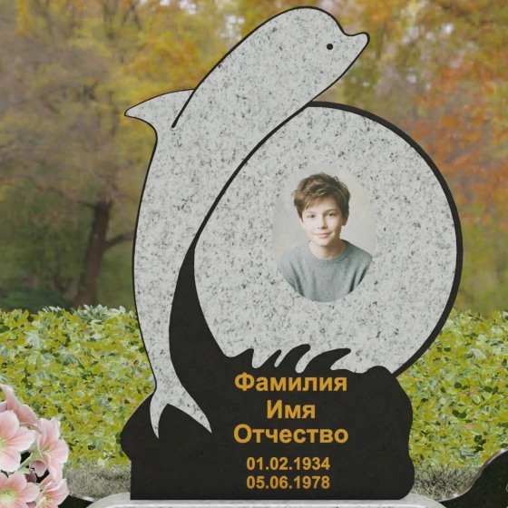 Этот гранитный монумент представляет собой не просто мемориальный знак, а настоящую художественную композицию, преисполненную глубокого символизма. Центральное место в дизайне занимает фигура дельфина — древнего символа спасения, чистоты и проводника душ в лучший мир. Плавный, динамичный изгиб морского обитателя словно обнимает центральный медальон, создавая защищенное, камерное пространство для портрета близкого человека. Мастера добились удивительной игры контрастов: зеркально отполированное туловище дельфина эффектно выделяется на фоне матовой, детально проработанной резьбы в основании, имитирующей морскую пену и гребни волн.