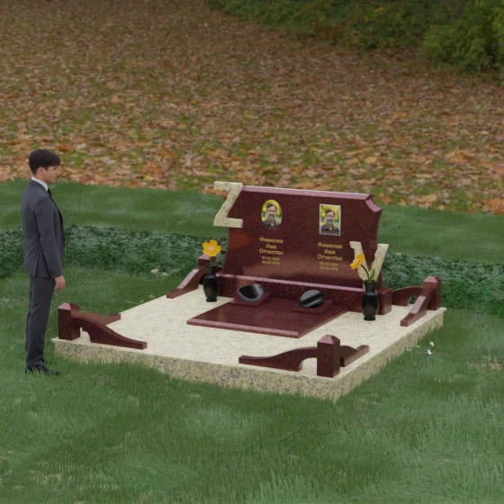 Данная мемориальная композиция включает в себя полное благоустройство участка, что избавляет от необходимости дополнительного оформления. Основанием служит высокий гранитный цоколь, обеспечивающий устойчивость и долговечность всей конструкции. Территория полностью закрыта монолитными надгробными плитами с зеркальной полировкой — это не только придает захоронению величественный вид, но и значительно упрощает уход, предотвращая рост сорной травы и скопление влаги.