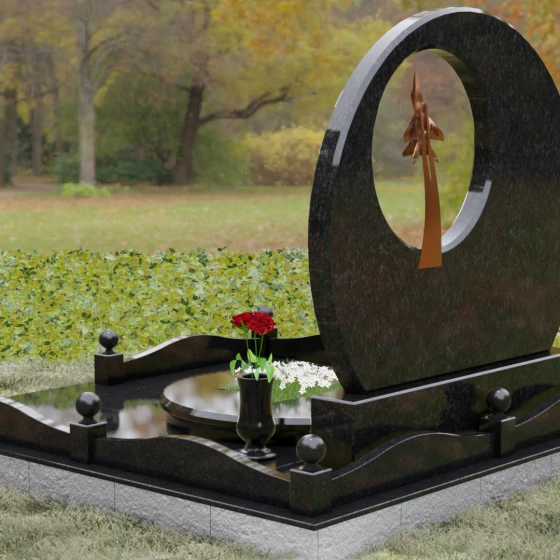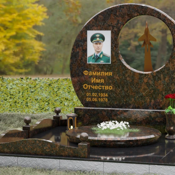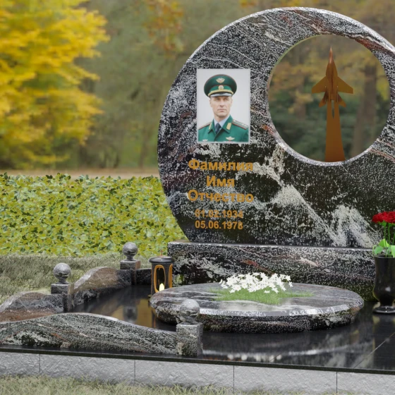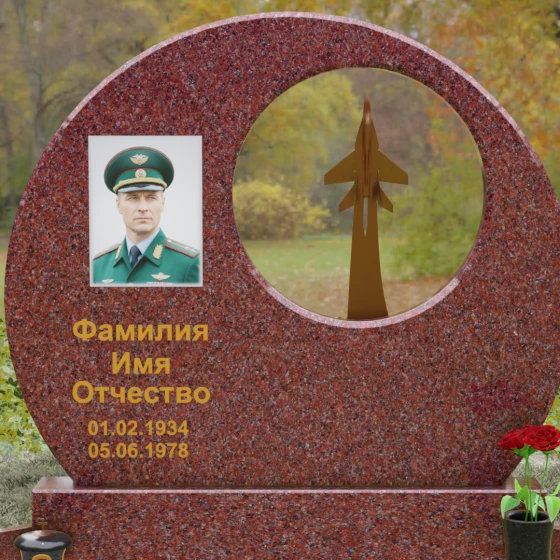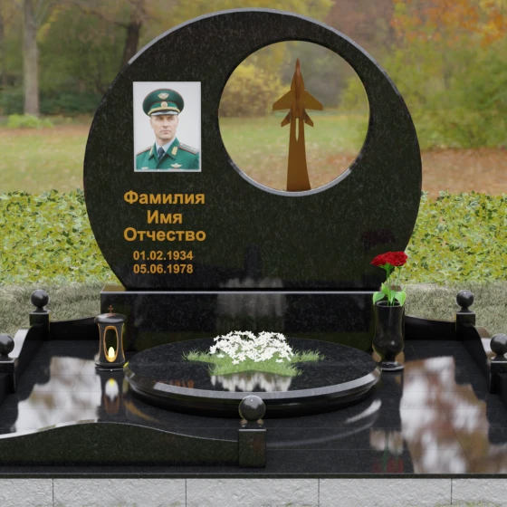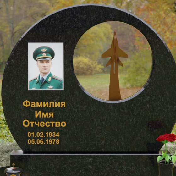 Выбор мемориальной композиции — это всегда поиск баланса между земной скорбью и небесным триумфом человеческого духа. Данная величественная стела, выполненная в уникальной геометрии круга с асимметричным сквозным вырезом, представляет собой не просто памятный знак, а глубокое философское высказывание. Символизм окружности отсылает нас к идее бесконечности, небесного свода и завершенности жизненного пути. Внутреннее пространство стелы акцентировано филигранной металлической фигурой взмывающего ввысь истребителя. Этот элемент несет в себе мощный эмоциональный заряд: он олицетворяет прорыв сквозь земные преграды, вечный полет и верность призванию, которое сильнее самой смерти.