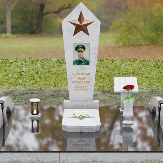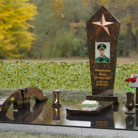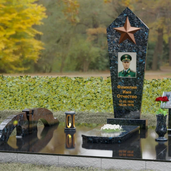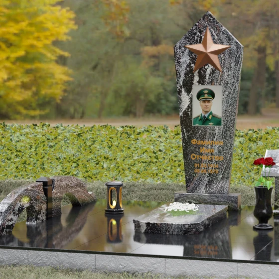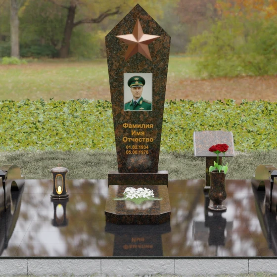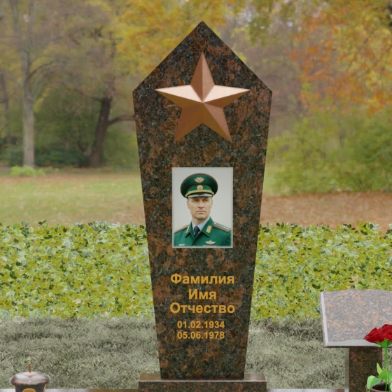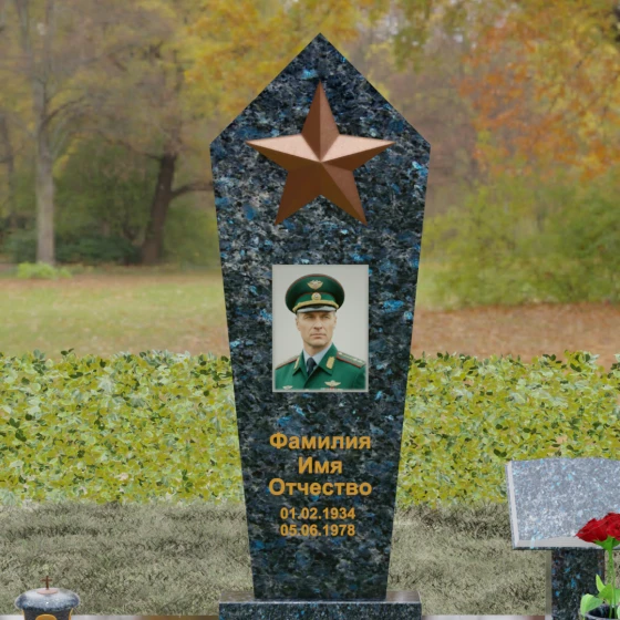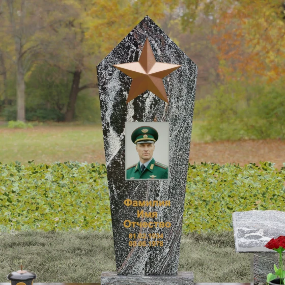 В верхней части стелы расположена объемная пятиконечная звезда, выполненная в технике накладного рельефа. Она является главным смысловым акцентом, контрастируя по цвету и фактуре с зеркальной поверхностью основного камня. Ниже расположен прямоугольный портрет на керамической основе, интегрированный в плоскость стелы с безупречной точностью. Завершает художественный образ гравировка текста, выполненная глубоким шрифтом с золочением, что обеспечивает читаемость надписей на десятилетия вперед.