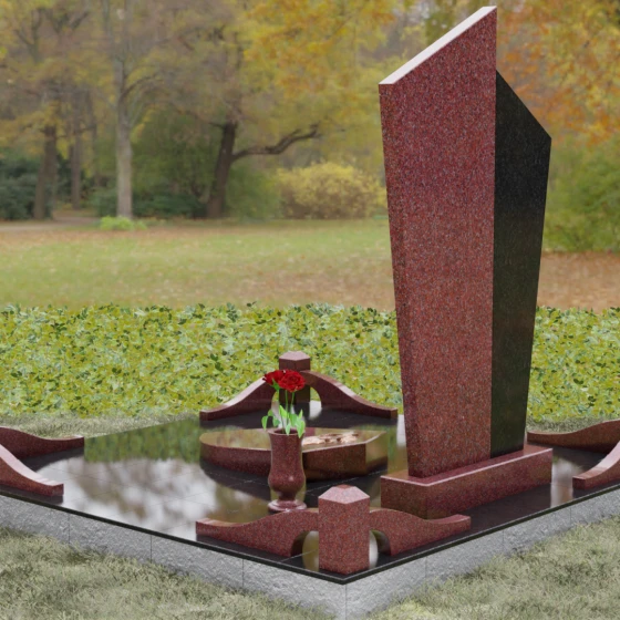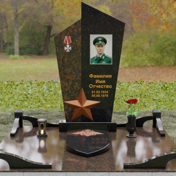 Данная мемориальная композиция представляет собой воплощение архитектурной эстетики и глубокого символизма. Выбор этой модели продиктован её уникальной асимметричной формой, которая отходит от классических канонов в сторону современного монументального искусства. Стела состоит из двух сопряженных сегментов, выполненных в контрастной цветовой гамме, что позволяет подчеркнуть многогранность личности усопшего. Левая часть, обладающая выраженной фактурой натурального камня, служит идеальным фоном для размещения наградной символики, в то время как правая — глубоко черная, зеркально отполированная панель — предназначена для основного портрета и памятных надписей.