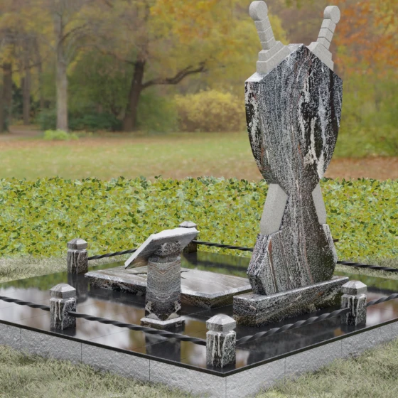 Центральным элементом изваяния выступает величественная стела, выполненная в форме щита, за которым покоятся два перекрещенных меча. Геометрия модели выстроена на игре контрастов и смыслов: щит олицетворяет защиту, стойкость и завершенность жизненного пути, в то время как мечи, направленные острием вниз, символизируют окончание битвы и обретенный покой. Верхняя часть щита увенчана объемным золоченым барельефом в виде двуглавого орла, что подчеркивает принадлежность к государственному служению и преемственность поколений. Особое внимание уделено фактурному решению: основное полотно стелы обладает безупречной зеркальной полировкой, в которой отражается мир, в то время как рукояти и клинки мечей выполнены из светлого гранита с благородной матовой фактурой, создавая эффект объема и осязаемости.