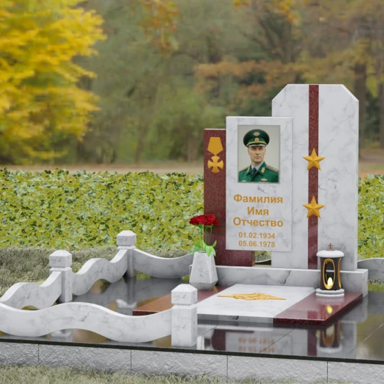 Выбор мемориального комплекса — это всегда поиск баланса между строгостью формы и глубиной чувств. Модель Артикул 201 представляет собой сложную архитектурную композицию, которая идеально подходит для увековечивания памяти сильного, волевого человека, посвятившего жизнь служению. Надгробие из натурального камня состоит из трех вертикальных элементов, создающих динамичный, ступенчатый силуэт. Центральная стела, предназначенная для размещения портрета и основной информации, обрамлена боковыми пилонами из контрастного красного гранита. Такая геометрия символизирует устойчивость, надежную опору и непоколебимость духа. Сочетание строгих прямых линий и аккуратных фасок на вершинах придает памятнику торжественный, парадный вид, подчеркивая заслуги и особый статус усопшего.