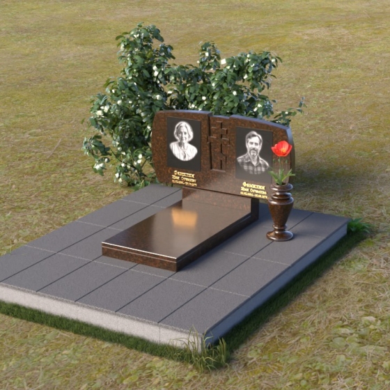 Геометрия модели тщательно продумана. Верхняя часть стел имеет скругленные углы, смягчающие строгость линий и придающие композиции более человечный облик. Между портретами выгравирован лаконичный православный крест, напоминающий о духовности и вере. Основание стел переходит в горизонтальную плиту, образуя единую плоскость с надгробной плитой. Надгробная плита выполнена в виде прямоугольника с полированной поверхностью, отражающей небо и окружающий мир. У основания композиции располагается аккуратная ваза из черного гранита, предназначенная для живых цветов, как символ непреходящей любви и уважения.