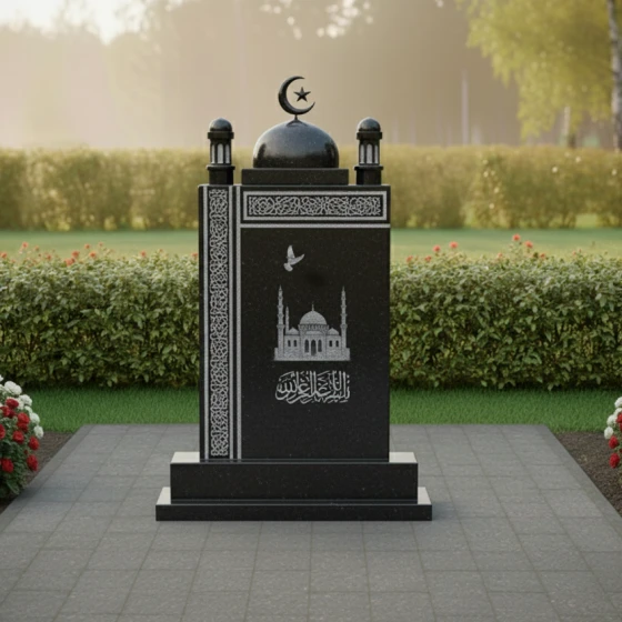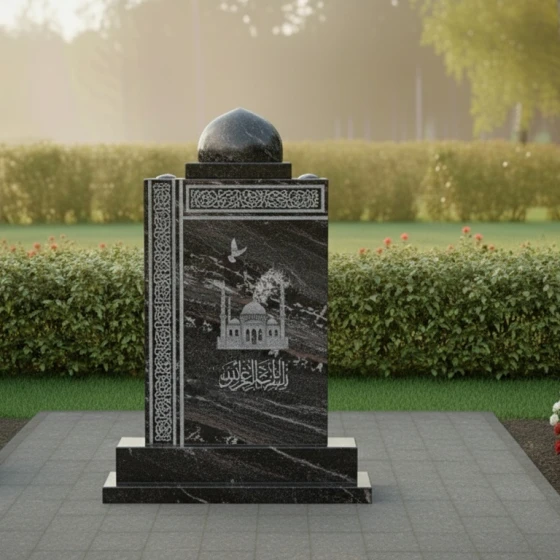 На фронтальной плоскости методом художественной гравировки нанесен детализированный образ мечети, чьи минареты и купола словно проступают сквозь толщу камня. Выше парит голубь — символ чистоты помыслов и мирного пути души к свету. Тончайшая вязь арабской каллиграфии в нижней части стелы и изящные геометрические орнаменты, обрамляющие левую грань и верхнюю часть полотна, создают игру контрастов между матовой фактурой гравировки и безупречным черным глянцем полированной поверхности.