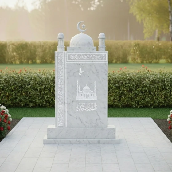 Данное изваяние представляет собой сложный архитектурный ансамбль, выполненный с ювелирной точностью. Центральная стела имеет строгую прямоугольную форму, которую венчает величественный купол, завершенный филигранно вырезанным мусульманским полумесяцем со звездой. По бокам от основного свода расположены декоративные элементы, имитирующие верхушки минаретов с имитацией ажурных решеток, что придает всей конструкции вид священного храма. Особое внимание стоит уделить обработке кромок: каждая фаска снята под идеальным углом, подчеркивая монументальность и четкость линий.