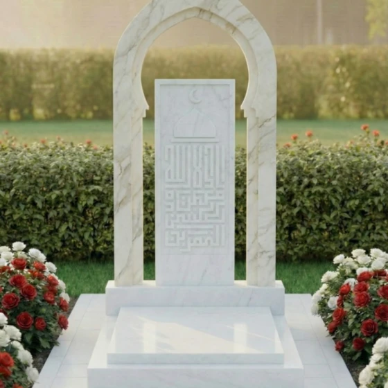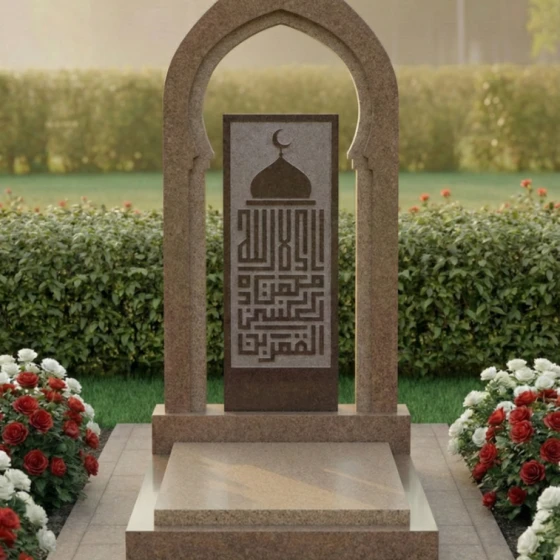 Представляем вашему вниманию модель памятника ПН 506 – это не просто надгробие из натурального камня, а истинное произведение искусства, призванное увековечить светлую память о близком человеке с глубоким почтением и достоинством. Каждая линия, каждый изгиб этого монумента пронизан смыслом и гармонией, создавая ощущение вечности и спокойствия. Центральная стела выполнена в форме изящной арки, напоминающей вход в священное место или портал в иной мир. Ее грани тщательно обработаны, создавая плавные переходы от полированных, зеркальных поверхностей к матовым, словно слегка припорошенным временем, срезам камня. Эта игра контрастов черного и серого гранита придает монументу невероятную глубину и объем, позволяя свету скользить по камню, подчеркивая его благородную текстуру. Внутри арки расположена прямоугольная вставка из светлого гранита, на которой выгравирована сложная каллиграфическая композиция, увенчанная полумесяцем и звездой – символами ислама. Эта гравировка выполнена с поразительной детализацией, где каждый элемент орнамента и каждая буква прорисованы с ювелирной точностью, создавая эффект кружевного узора, который кажется вырезанным из самого камня. Благодаря контрасту светлой гравировки на темном фоне, надпись читается легко и выразительно, притягивая взгляд и приглашая к размышлениям.
