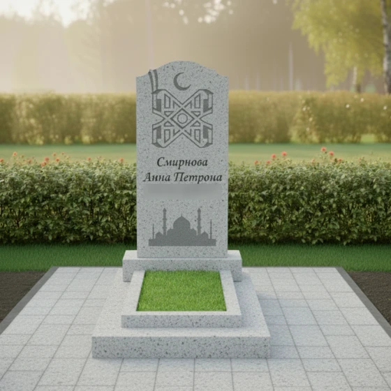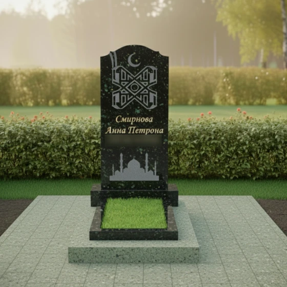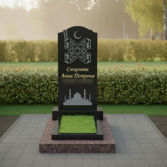Особое внимание привлекает филигранная гравировка, расположенная в верхней части стелы. Символ полумесяца и сложный геометрический орнамент, выполненные с ювелирной точностью, подчеркивают конфессиональную принадлежность и глубокую связь с верой. В нижней части полотна расположено контурное изображение мечети с высокими минаретами — это не просто декор, а символ духовного пристанища и покоя. Сочетание глянцевой поверхности основного камня и матового, светлого напыления внутри резных элементов создает благородный контраст, делая изображение объемным и читаемым при любом освещении.